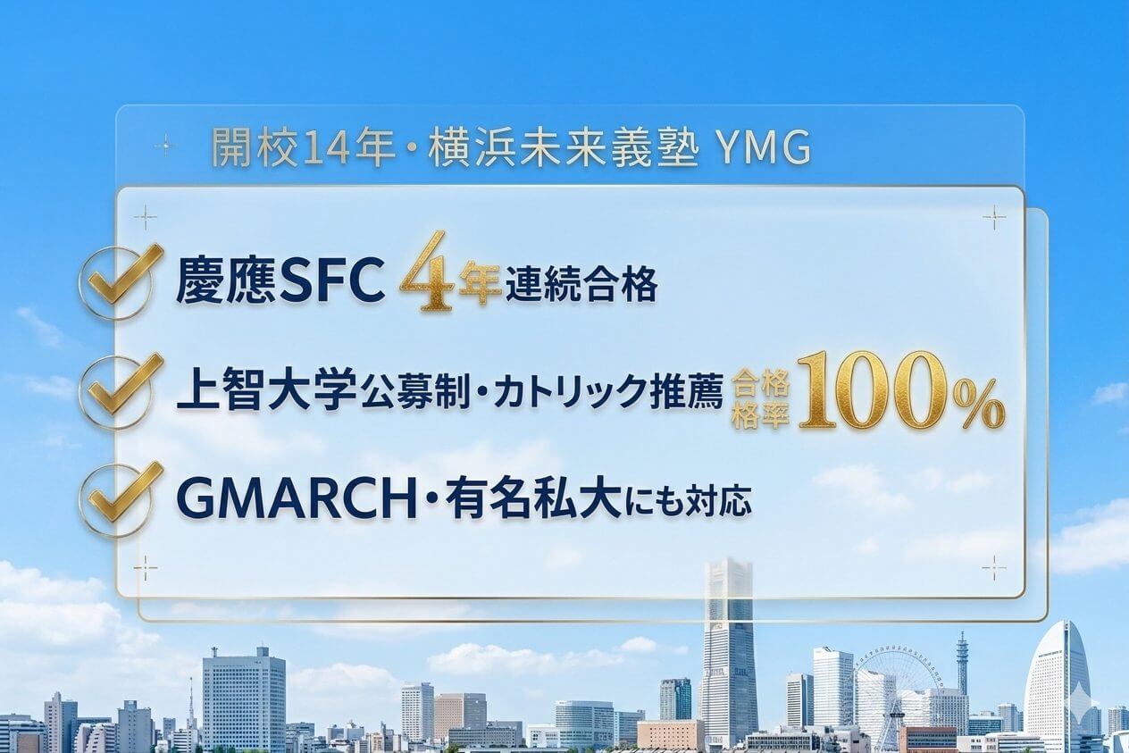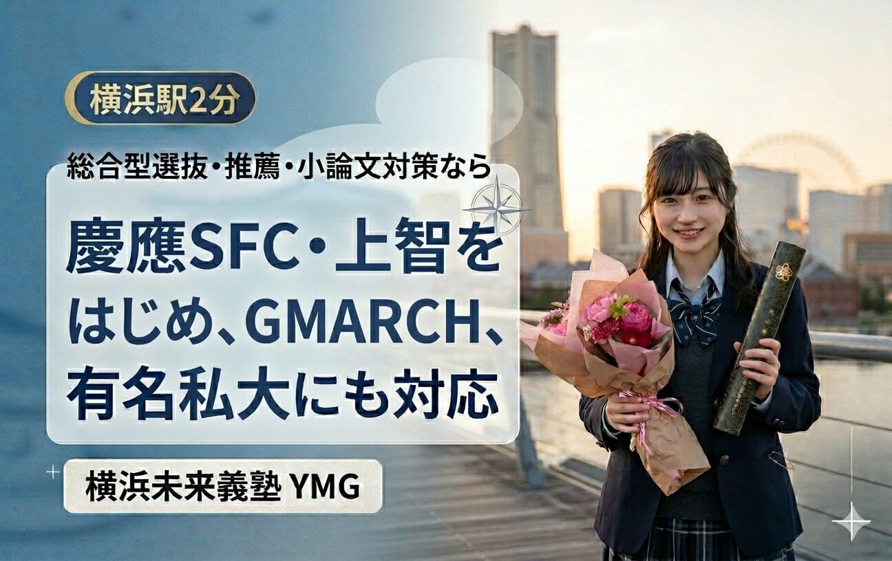 横浜未来義塾(YMG)では、「何を言うか」ではなく「何を論点として立てるか」から設計し、 慶應SFC・上智(公募/カト推)・早稲田・GMARCH・準難関大学まで、大学の出題意図に合わせて“通る形”に整えます。